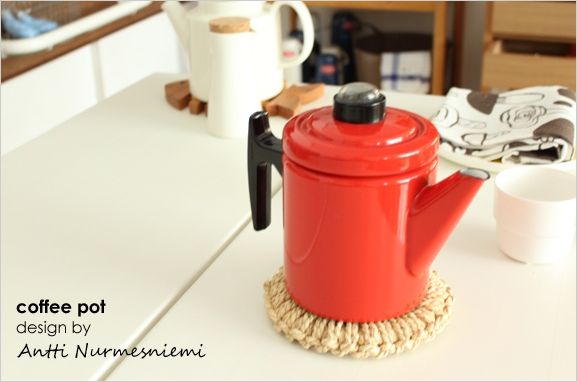 1960年代から80年代ころフィンランドで一般的に広く愛されたホーロー家庭キッチン用品のメーカーでカラフルなホーロー製品が有名です。なかでもこのAntti Nurnesniemiのコーヒーポットは時代を超えて愛され続けられているロングライフなデザインです。