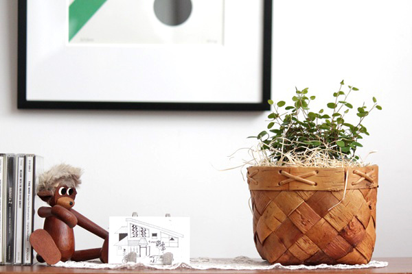 こちらは 蔓で細工された白樺のフラワーバスケット。もとは草花を飾るポットカバーとして作られましたが、小物やハガキ、ステーショナリー類のスタンドとしても いいですね。