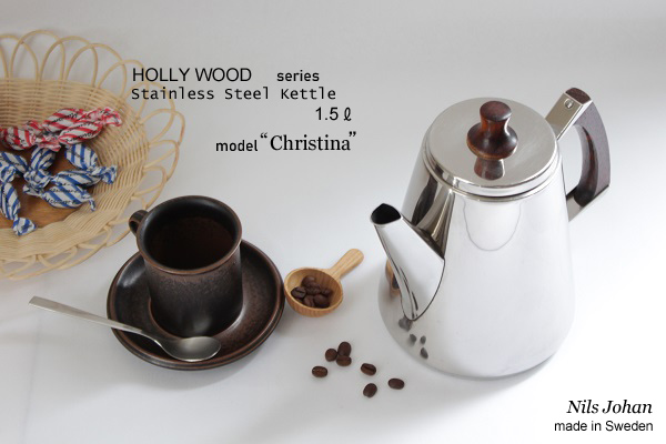 | | スウェーデンのNilsJohan(ニルスヨハン社)製のステンレスケトルです。Christina(クリスティーナ)と名付けられたこのモデルは持ち手と蓋のつまみがウッドで作られた とても素敵なケトルです。