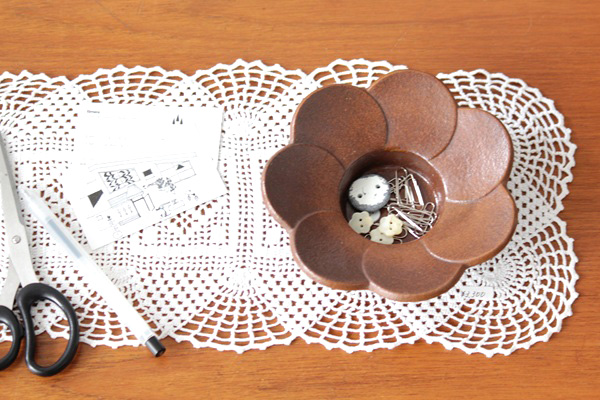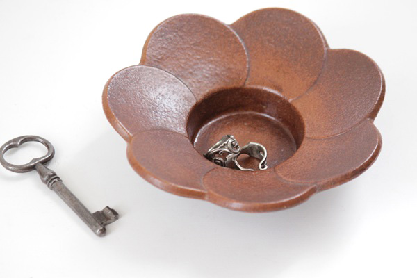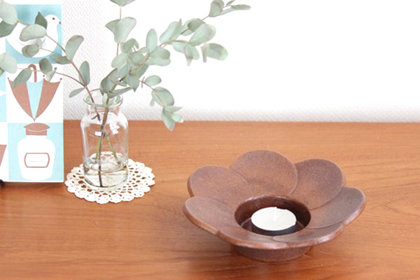 通常は花びらの部分に金色で模様が描かれていますが こちらは絵付けを忘れた?!シンプルに茶系のみ施釉で仕上げた珍しい作品。キャンドルホルダーとしてのご利用はもちろん、アクセサリーやコイン・鍵など小物置きとして、またインテリアとしてそのまま飾っても素敵な陶器作品です。