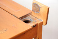 擦りキズやあたりキズ、側面にヒビ、テーブルトップにペイント剥がれ、内側に落書き、脚に擦り汚れなどありますが 学校の机として使用されていたものなので、とても丈夫なつくりです。問題なくまだまだ十分にご利用頂けます。