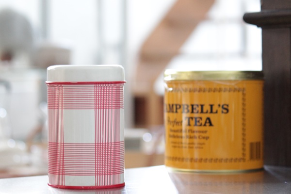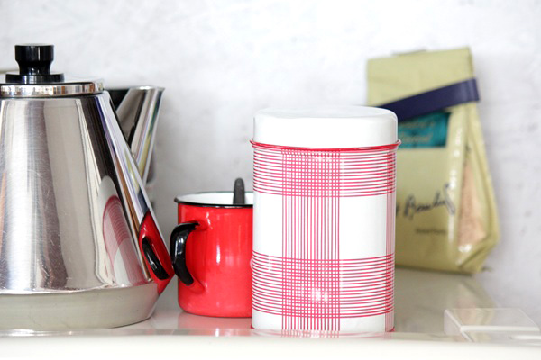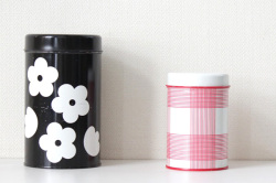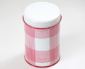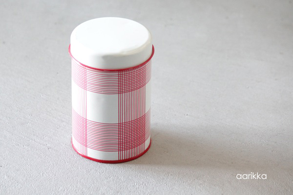 こちらは 小さめのSサイズで 赤いピンラインのチェック柄です。格子状のシンプルな柄で保存缶としてはもちろん、インテリアのワンポイントとしても楽しいですね。