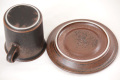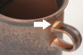カップ裏高台に小さな凹み、持ち手の付け根に 施釉ムラで薄く白くなっている箇所がありますがいずれも製造時レベルで不良不具合ではありません。