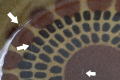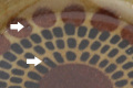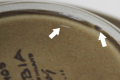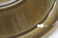 矢印部分、表面に小さなピンホール(針で突いたような点)、小さな凹凸、裏底高台に焼きジミ、ふちに白点(いずれも製造時レベル)、その他 光にかざすとカトラリー擦りキズや重ね擦れはありますが、実際には気になるほどではなく、見た目・ご利用にも問題ありません。