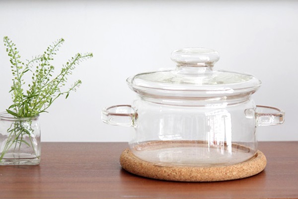 こちらは鍋敷き付きの両持ち手の小さめお鍋(キャセロール)、温かいものはもちろんのこと 冷たいお料理もいいですね。またフルーツやお菓子を入れてそのまま棚置きでも素敵です。