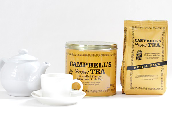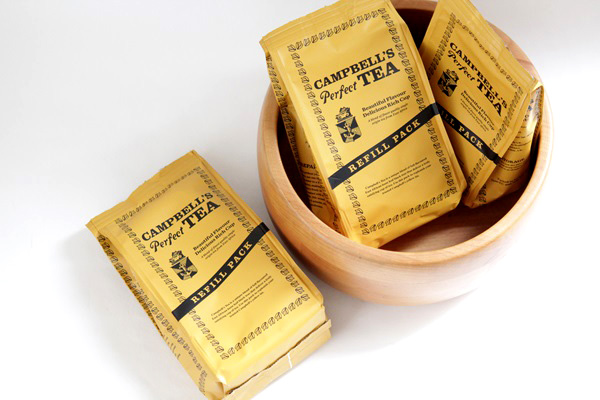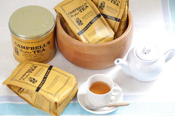 アイルランド生まれの紅茶、ゴールデンイエローの缶と同じくイエローに黒のロゴが入った袋のキャンベルズ・パーフェクト・ティーです。