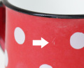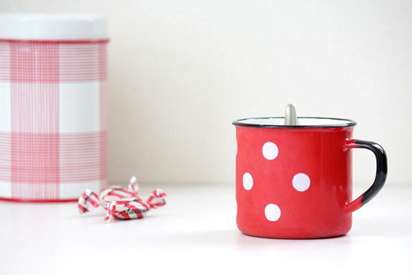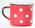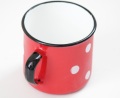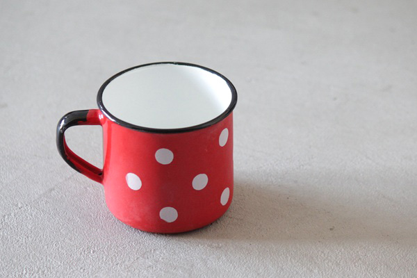 こちらはポーランドで作られた、ホーロー製のマグカップです。レッドベースに白いドットがとても可愛らしく インテリアにも◎