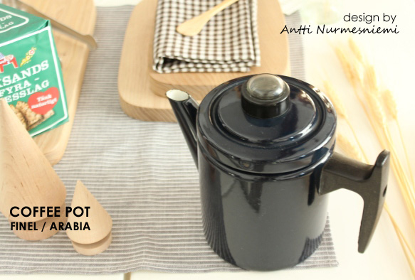 1960年代から80年代ころフィンランドで一般的に広く愛されたホーロー家庭キッチン用品のメーカーでカラフルなホーロー製品が有名です。なかでもこのAntti Nurnesniemiのコーヒーポットは時代を超えて愛され続けられているロングライフなデザインです。