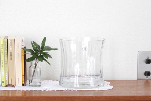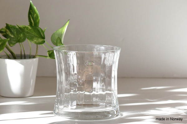 Norwayのガラス工房でハンドメイドで作られたガラス花瓶です。 シンプルでどっしりとした円柱型、ストライプのように ぐるりと滑らかに模様がつけられ 光にあたるととても綺麗でインテリアとしても素敵です。