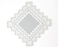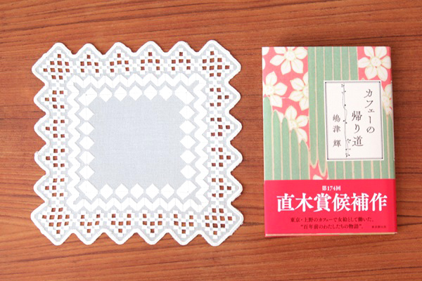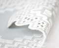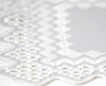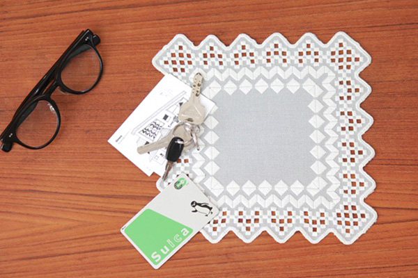 落ち着いた色合いの薄いグレーをベースに 白糸で幾何学模様の刺繍は ひかえめながら 存在感あるテーブルトップ / 敷物としてお楽しみ頂けます。