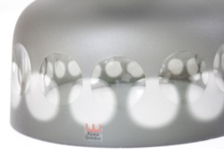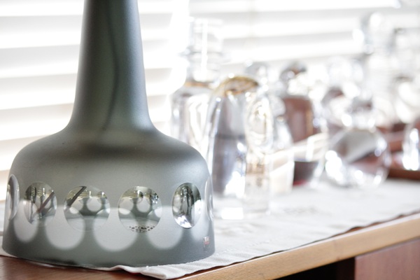 スモークがかったダークグレーの しっかりとしたガラスの本体にクリアの円形が ぐるりと模様のように削られデザインされています。