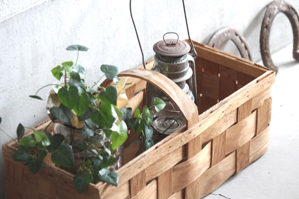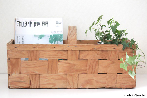 こちらはスウェーデンでおそらく1950年代から60年代につくられた横長のバスケット。A4サイズの雑誌が2冊並んで収納できるサイズで、キッチンクロスや布類を収めるのにも活躍します。またグリーンとの相性がとても良いのでプランターのように使っても◎