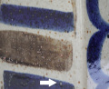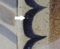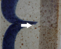 矢印部分、裏底に削れて施釉が白くなっている部分、陶器製品特有の多少の凹凸やピンホール(針で突いたような点)、焼きジミ、濃淡はありますがいずれも製造時レベルで不良不具合ではありません。 全体的にヒビ・カケのない綺麗な良い作品です。