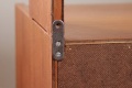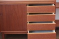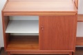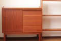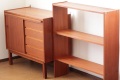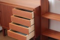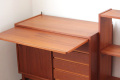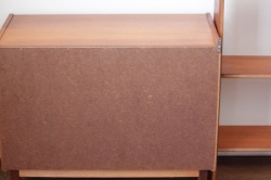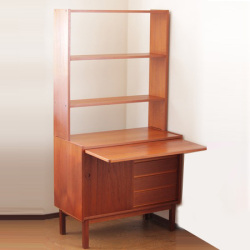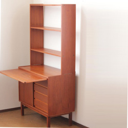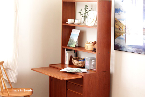 こちらはスウェーデン製のチーク材ブックシェルフです。下の収納部分は4段の引き出しと戸を開けると上下の収納。そしてちょっと便利なスライド式のテーブルが付きます。