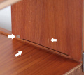 経年使用による棚あとや側面に木ヤケ、小さなあたりキズ、擦りキズ、4段引き出しの底に使用による薄くクスミや小さな擦り汚れ、脚のところどころに 擦りキズなどはありますが、いずれも見た目・ご利用にもまったく問題なく 50~60年まえの製品として、全体的には綺麗なコンディションです。
