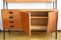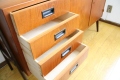 取外し、幅の調整が可能な棚と、棚板式の引出しが3列、鍵付の開き戸に、引き出しが4段あり、タップリの収納力があります。