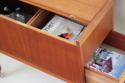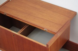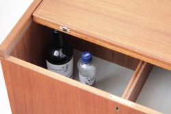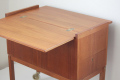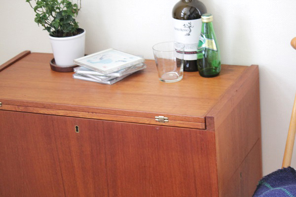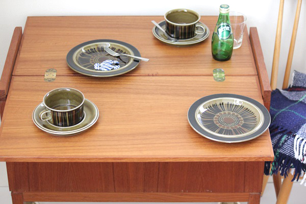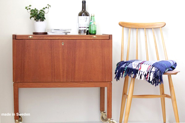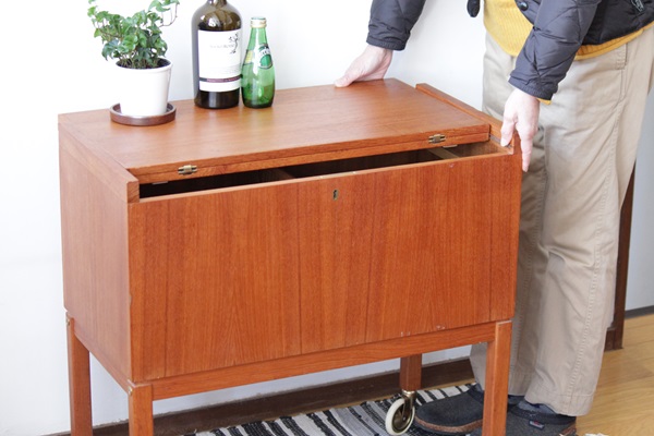 スウェーデンで1960年代から70年代にかけ作られたワゴン式のサイドテーブルです。トップの天板は開くと約70cm四方のテーブルになります。内側には大小3つの収納スペースがあり、ワインボトルを収納できたり雑誌などの収納も可能。さまざまなご利用方法が考えられ、インテリアとして草花や置物を飾っても素敵ですね。
