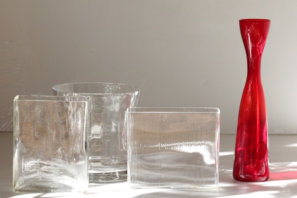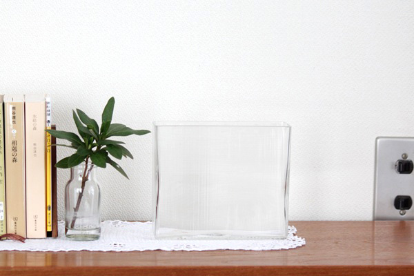 Sweden南部、ガラス工房が密集するエリアで買付した花瓶です。アンティーク商からは「地元の小さなガラス工房でハンドメイドで作られたガラス花瓶だよ」と聞きました。シンプルな長方スクエア型、細いスジ状の模様がつけられ 光にあたると綺麗に反射してインテリアとしても素敵です。